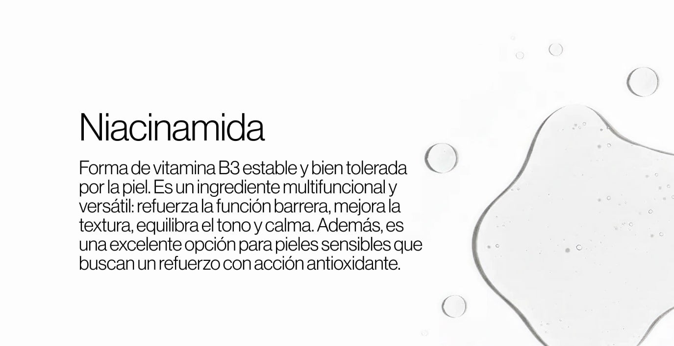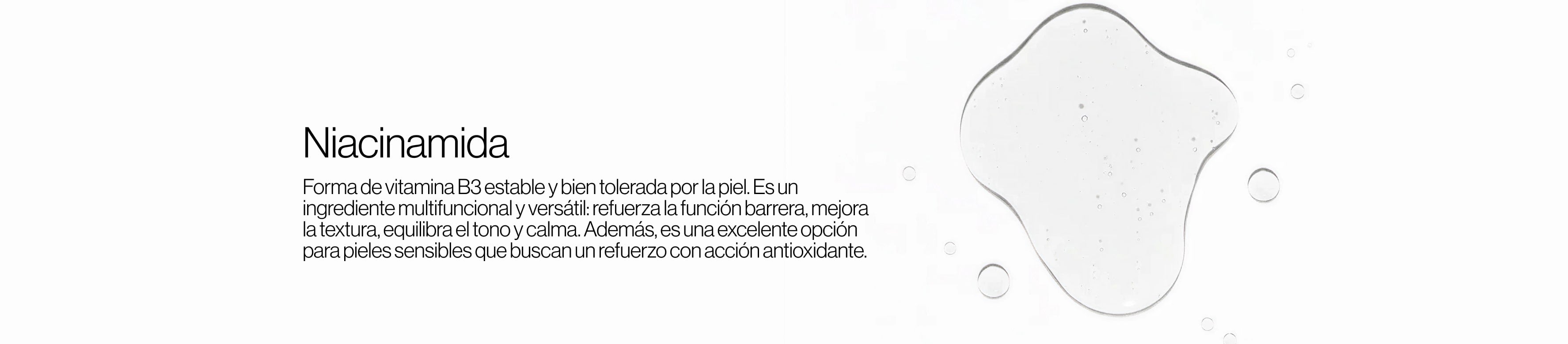 La niacinamida es una de las formas de vitamina B3. Es un activo multifuncional utilizado en cosmética, que actúa en la piel a través de diversos mecanismos, logrando una mejora visible en la textura y el aspecto global de la piel.